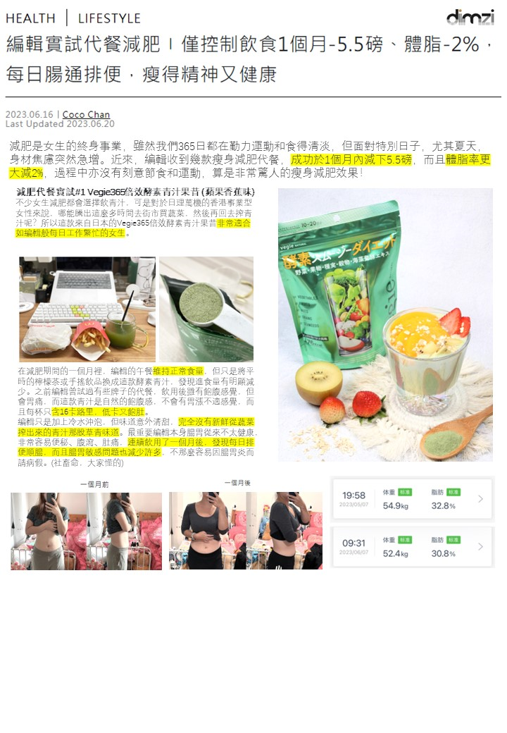 回購率極高的日本Vegie365倍效酵素果昔,隨了明星及網友實測有效之外,連日本養生專家同體適能教練都極力推薦!除了有效落磅,最重要係大大減少反彈同其他副作用情況。日本真實用家飲用3個月後更勁減9.3KG。