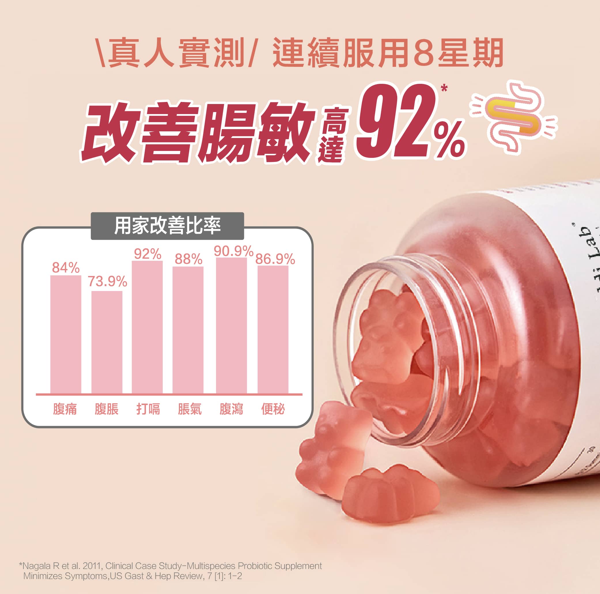 - 臨床實證, 連續服8星期,能顯著改善腸胃敏感高達92%*。