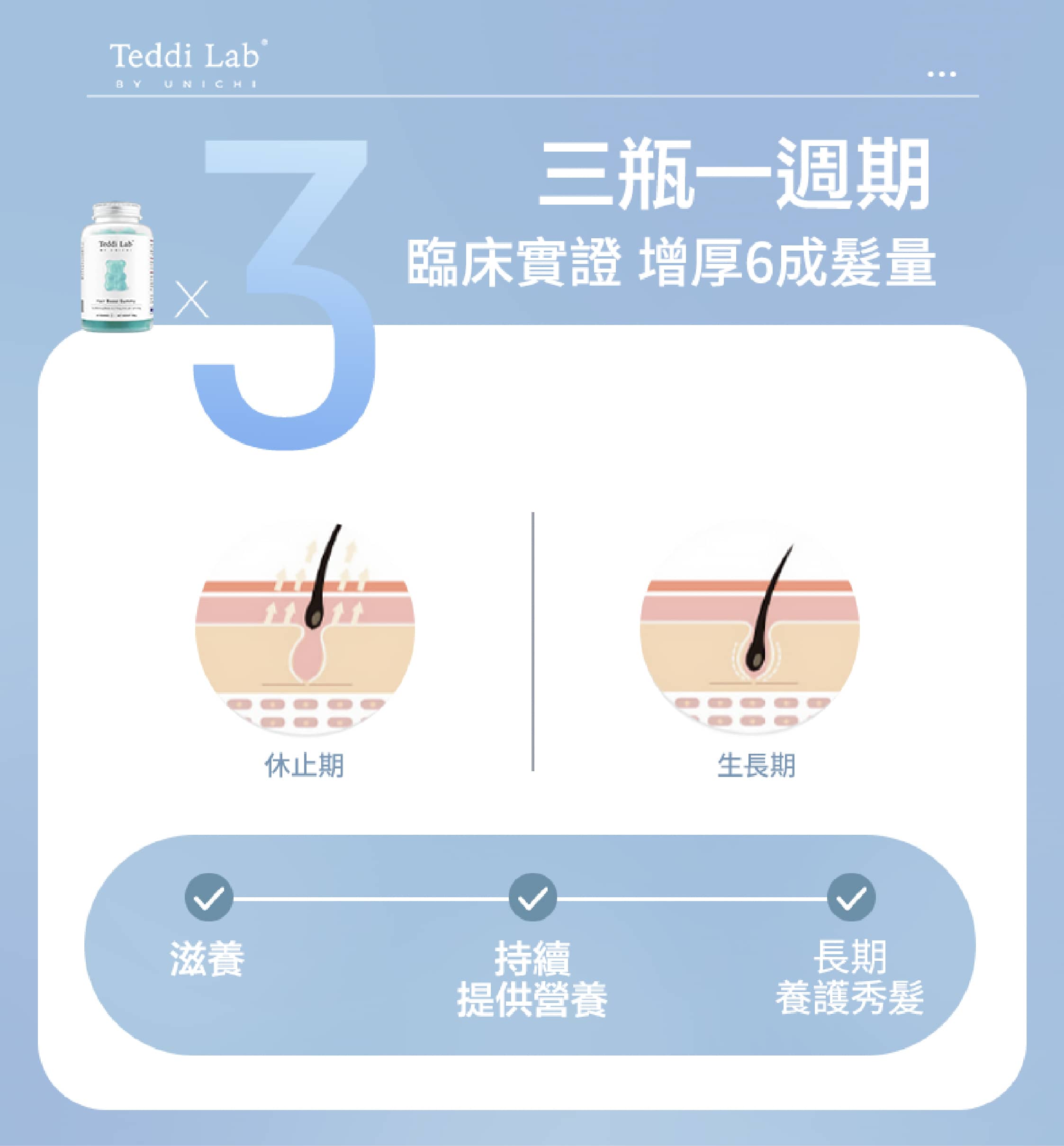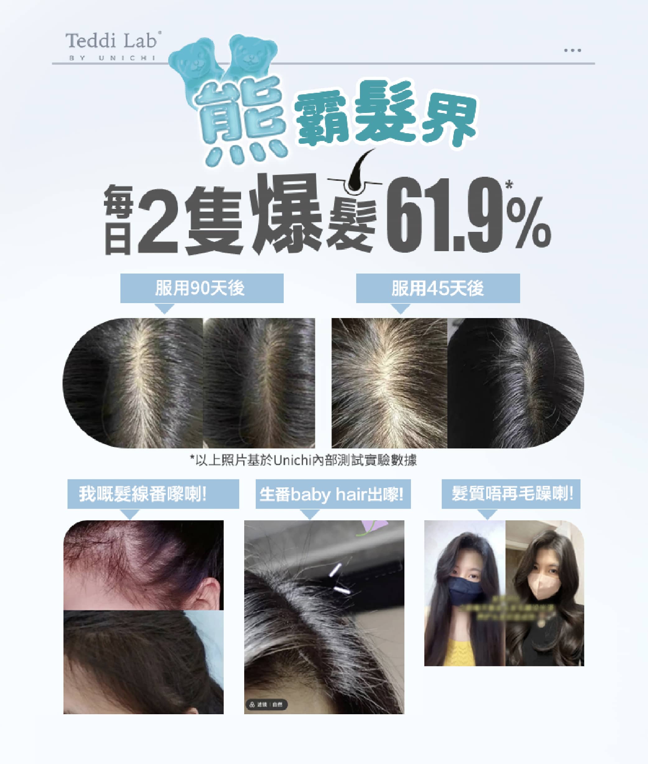 蘊含6種健髮配方: 生物素、鋅、泛酸和維他命A、C及E,有助強化髮絲、促進頭皮健康並增強整體頭髮的厚度。 在一項針對27位少髮量人士的臨床實驗顯示,服用生物素補健品4星期後,每6平方亳米髮量增長32%,8星期後增長61.9%!