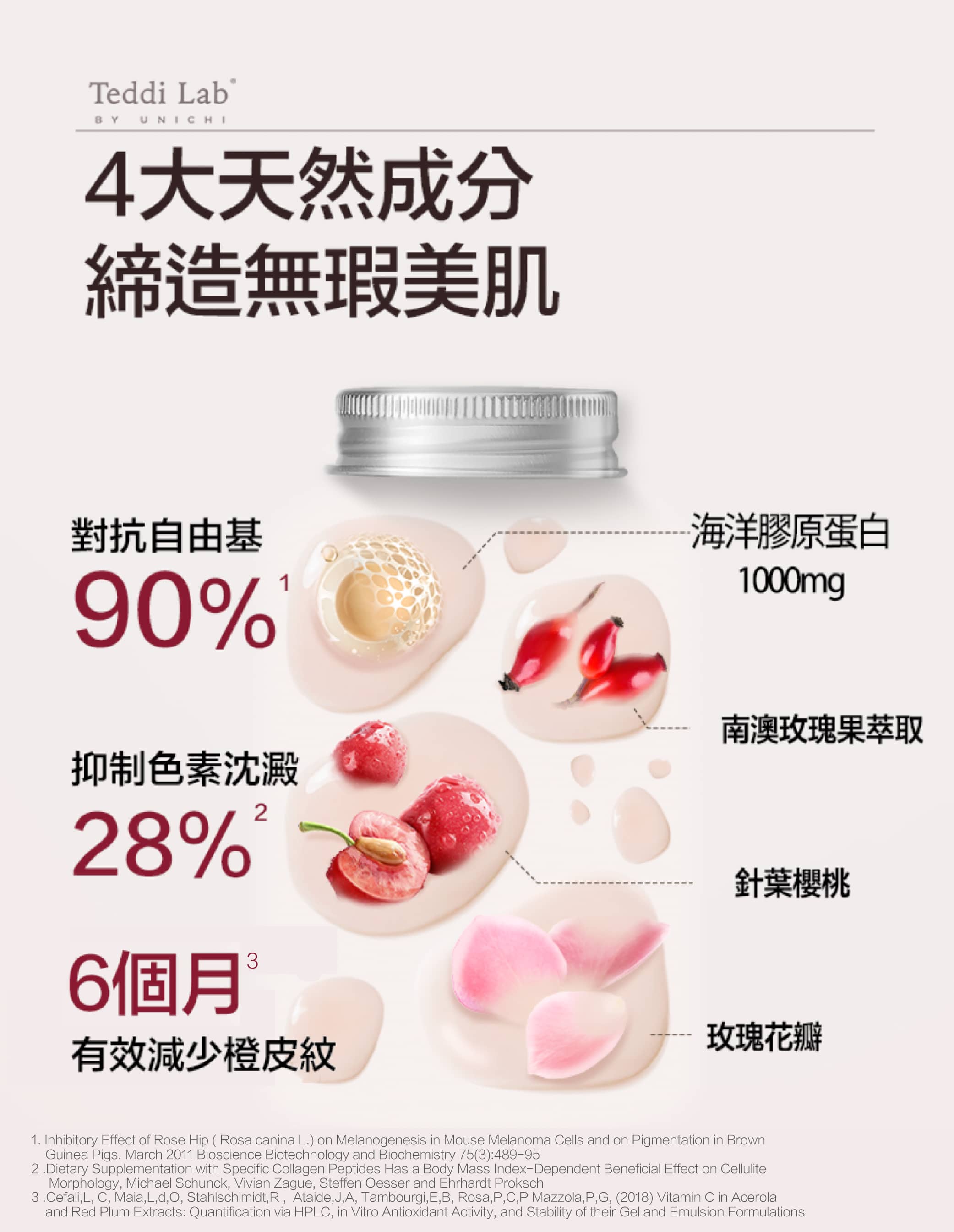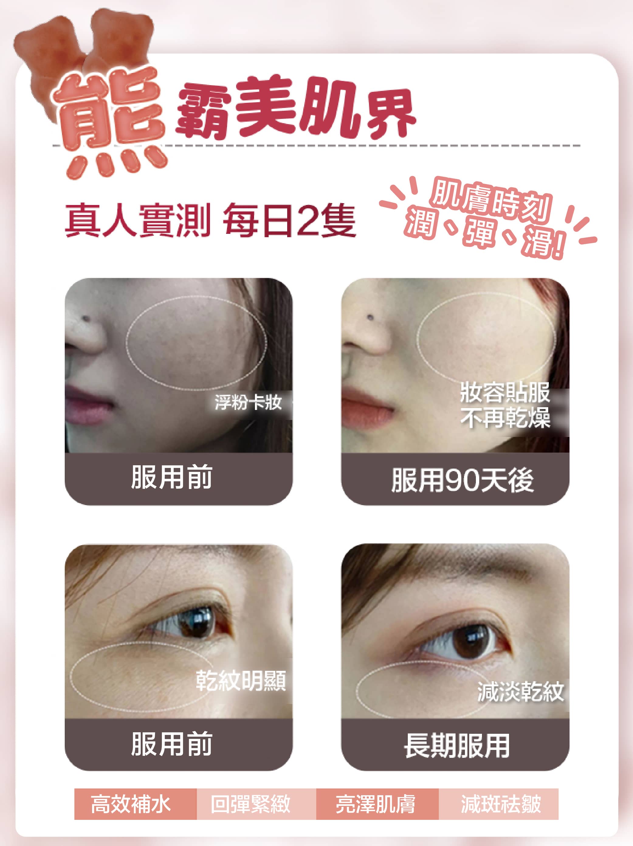 源自南太平洋深海紅鯛魚的膠原蛋白,每 2 粒軟糖富含1000毫克海洋膠原蛋白,為肌膚高效補水。臨床實證,能有效對抗自由基對皮膚的傷害高達90%*。